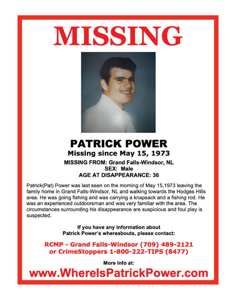 Patrick (Pat) Power was last seen on the morning of May 15, 1973, leaving the family home in Grand Falls-Windsor, NL and walking towards the Hodges Hills area. He was going fishing in that area and was seen carrying a knapsack and a fishing rod. He was an experienced outdoorsman and was very familiar with the area. The circumstances surrounding his disappearance are suspicious and foul play is suspected.